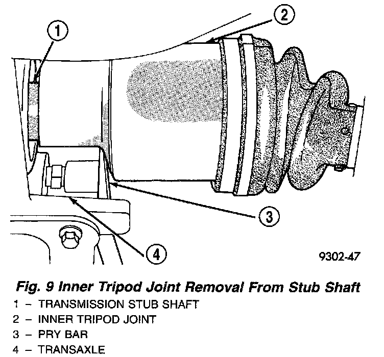 9. Dislodge inner tripod joint from stub shaft retaining snap ring on transaxle assembly (Fig. 9). Inner tripod joint is dislodged from stub shaft retaining snap ring, by inserting a pry bar between transaxle case and inner tripod joint and prying on tripod joint. Only disengage the inner tripod joint from the retaining snap ring. Do not attempt to remove the inner tripod joint from the transmission stub shaft at this time.