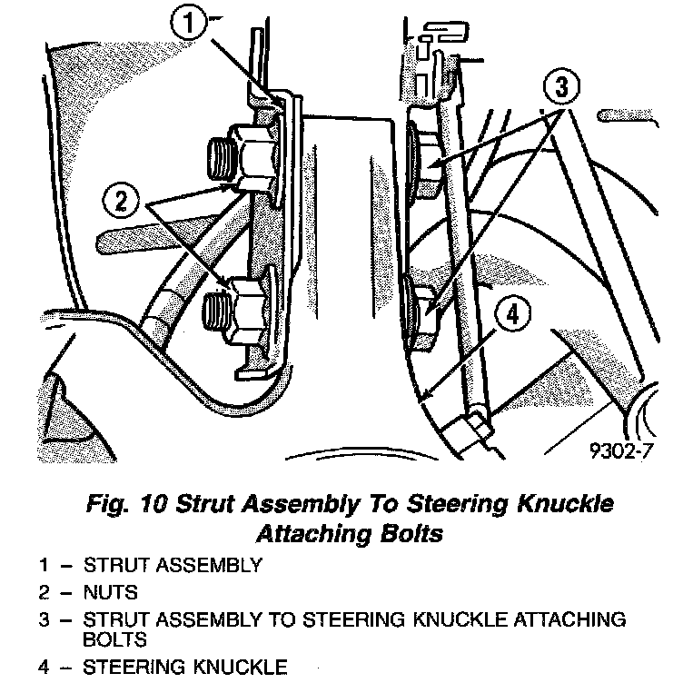 10. Remove the strut assembly to steering knuckle attaching bolts (Fig. 10).