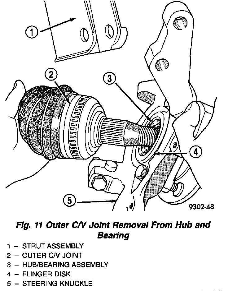 CAUTION: When removing outer ON joint from hub and bearing assembly, do not allow the flinger disk (Fig. 11) on hub and bearing assembly to become damaged. Damage to the flinger disk will cause dirt and water intrusion into bearing. Premature bearing failure will result.