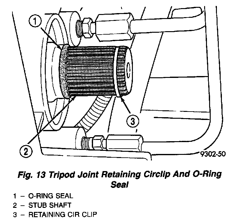 CAUTION: The inboard tripod joint retaining circlip and O-ring seal (Fig. 13) on the transaxle stub shaft are not re-usable. Whenever the inboard tripod joint is removed from the stub shaft, the retaining circlip and O-ring seal MUST BE REPLACED. The retaining circlip and O-ring seal is included in all service kits requiring removal of the inboard tripod joint from the stub shaft.