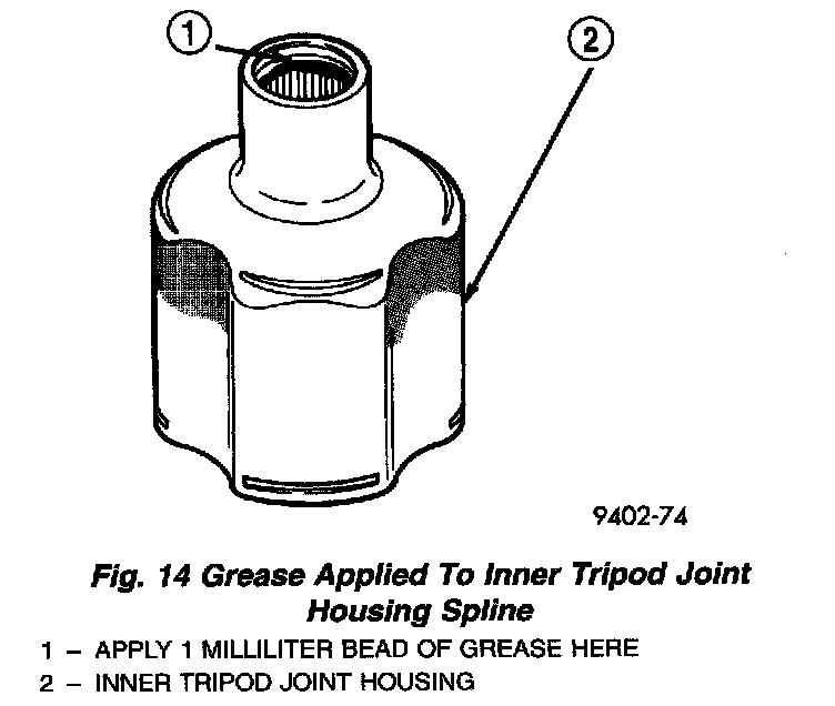 2. Evenly apply a bead of grease, such as Mopar Multi-Purpose Lubricant or an equivalent, around spline of inner tripod joint (Fig. 14) where the O-ring seats against tripod joint. This will spread grease onto stub shaft during tripod joint installation preventing corrosion and help to seal the O-ring.