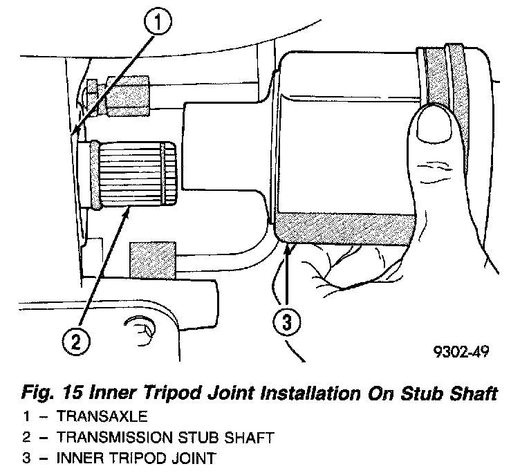 3. Install driveshaft through hole in splash shield. Grasp inner tripod joint in one hand and interconnecting shaft in the other. Align inner tripod joint spline with stub shaft spline on transaxle (Fig. 15). Use a rocking motion with the inner tripod joint, to get it past the circlip on the transaxle stub shaft.