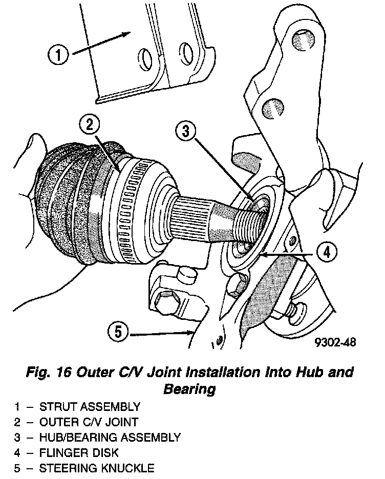 5. Hold outer C/V joint assembly with one hand Grasp steering knuckle with other hand and rotate it out and to the rear of the vehicle. Install outer C/V joint into the hub and bearing assembly (Fig. 16).