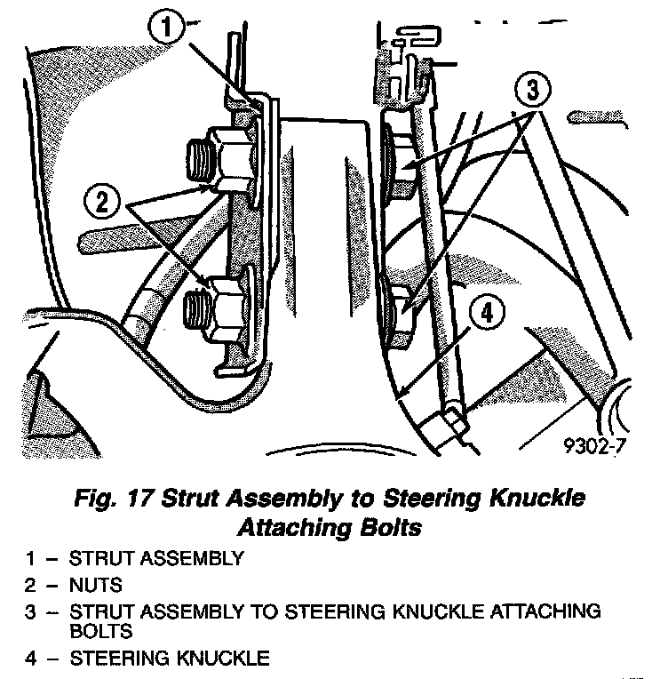 7. Install the strut assembly to steering knuckle attaching bolts. Install nuts on attaching bolts (Fig. 17). Tighten the strut assembly to steering knuckle bolt nuts to 169 Nm (125 ft. lbs.). TURN NUTS ON BOLTS. DO NOT TURN BOLTS.