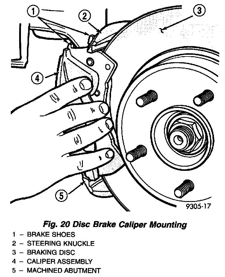 11. Install front brake caliper over braking disc and align with caliper mounting holes on steering knuckle (Fig. 20). Install the caliper to steering knuckle bolts. Tighten bolts to 19 Nm (168 inch lbs.).