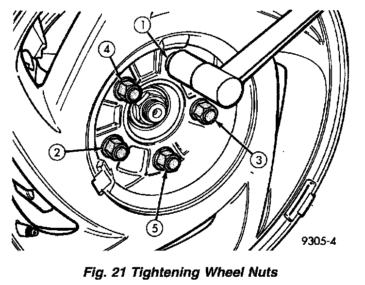 12. Install wheel and tire assembly on vehicle. Tighten the wheel mounting stud nuts in proper sequence (Fig. 21), until all nuts are tightened to half specification. Then repeat the tightening sequence to the full specified torque of 129 Nm (95 ft. lbs.).