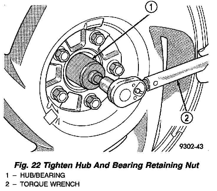14. Apply the vehicle's brakes to keep vehicle from moving. Tighten the NEW stub shaft to hub and bearing assembly retaining nut to 150 Nm (105 ft. lbs.) (Fig. 22).