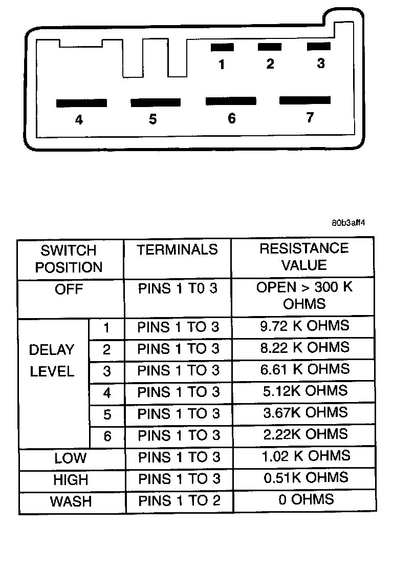To test the multi-function/wiper switch, first disconnect the switch wires from the body wiring in the steering column. Using an ohmmeter, test for continuity between the terminals of the switch, as indicated in the following continuity table. The identity of each terminal is shown.