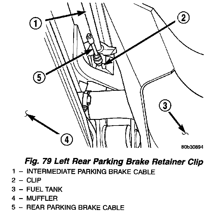 4. Remove the retainer clip securing the preferred rear park brake cable to the crossmember .