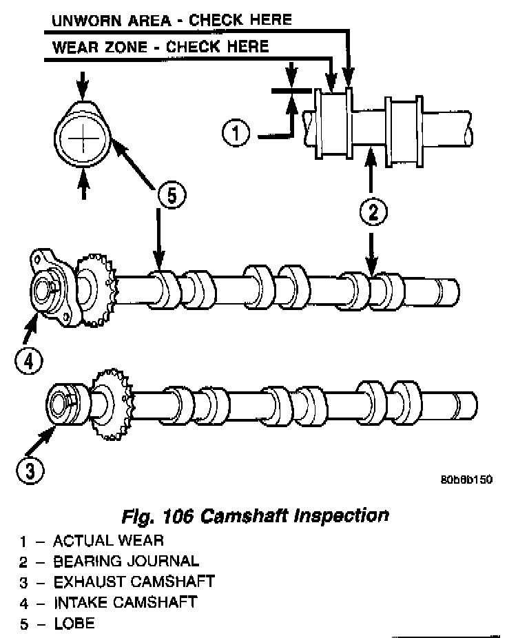 3. Check the cam lobe surfaces for abnormal wear and damage. Replace camshaft if defective. Measure the actual wear (Fig. 106) and replace, if out of limits-standard value is 0.0254 mm (0.001 inch); wear limit is 0.254 mm (0.010 inch).