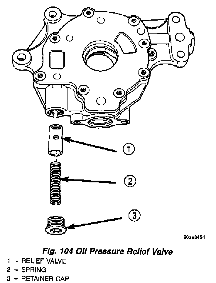 CAUTION: Oil pump pressure relief valve must be installed as shown in (Fig. 104) or engine damage may occur.