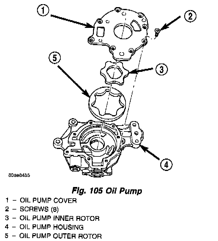 3. Remove oil pump cover screws and lift off cover plate (Fig. 105).