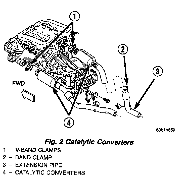 DESCRIPTIONThe close coupled, three-way catalytic converter inlets are connected to the exhaust manifolds by the use of V-Band clamps. The left side converter outlet pipe connects to the exhaust system. The right side converter connects to an extension pipe.