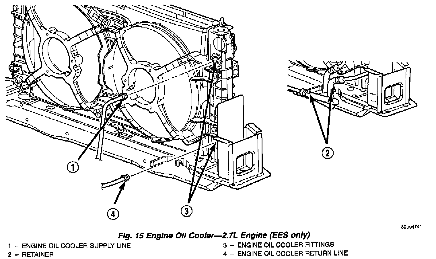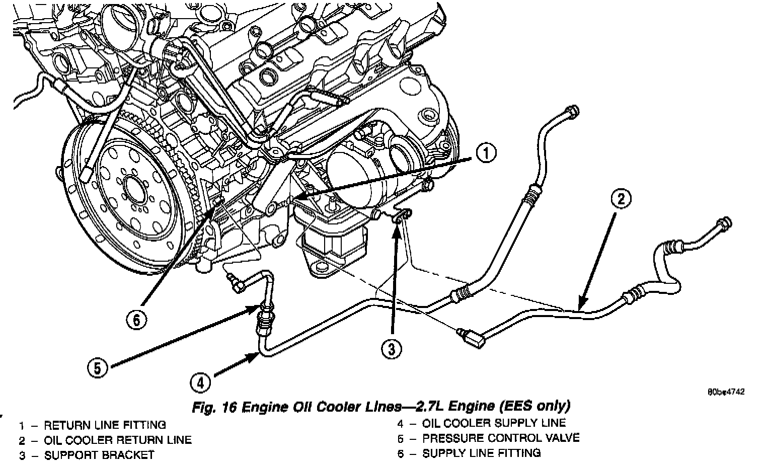 DESCRIPTIONThe 2.7L engine (Sales Code EES only) uses an engine oil cooler that is mounted inside the right radiator tank. Oil lines connect the cooler to the engine.