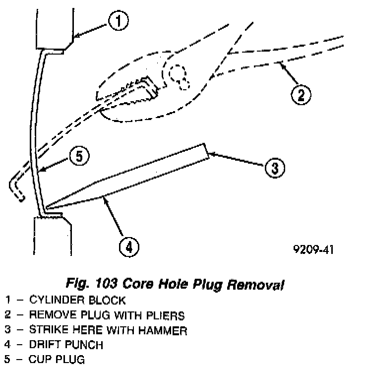 Using a blunt tool such as a drift and a hammer, strike the bottom edge of the cup plug. With the cup plug rotated, grasp firmly with pliers or other suitable tool and remove plug (Fig. 103).