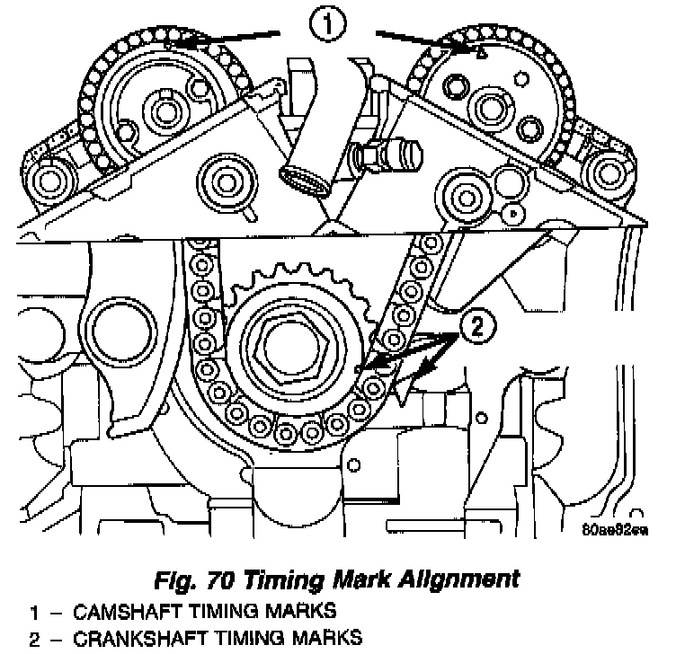 10. Verify that all chain timing (plated) links are properly aligned to the timing marks on all sprockets (Fig. 71).