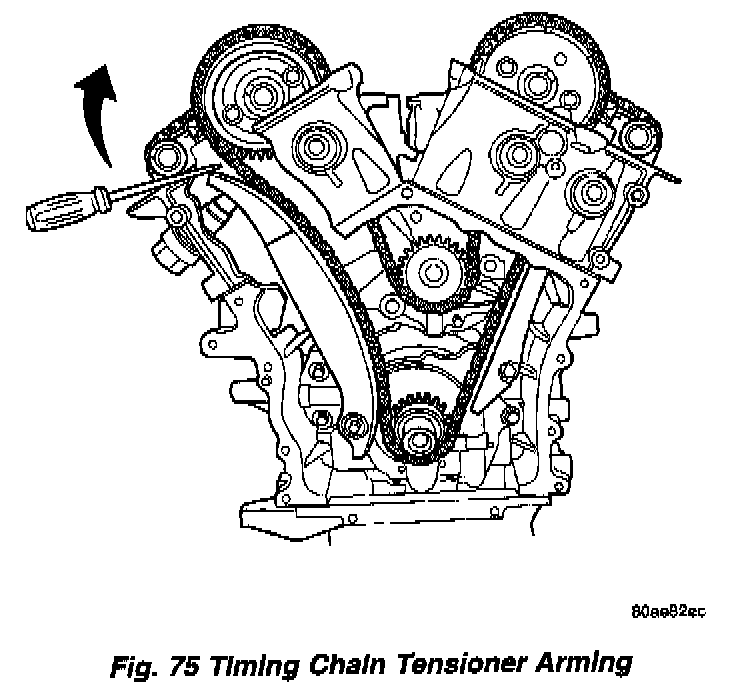 20. To arm the timing chain tensioner: Use a flat bladed pry tool to gently pry tensioner arm towards the tensioner slightly (Fig. 75). Then, release the tensioner arm. Verify the tensioner is armed (extends).
