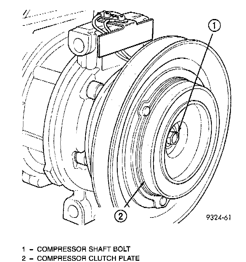 1. Remove the compressor shaft bolt. A band type oil filter removal tool can be placed around the clutch plate to aid in bolt removal.