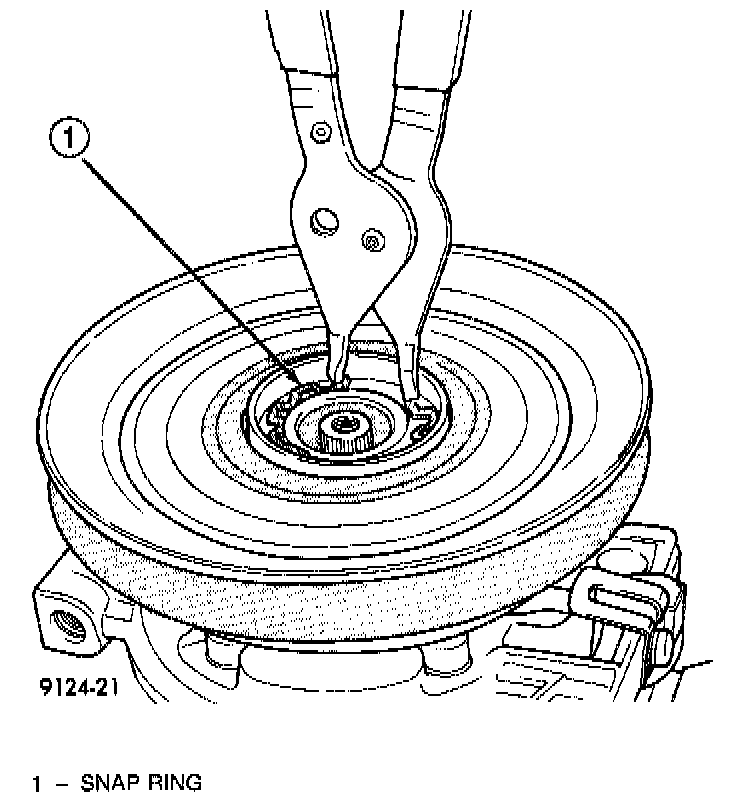 4. Install pulley assembly retaining snap ring (bevel side outward) with Snap Ring Pliers (C-4574). Press the snap ring to make sure it is properly seated in the groove.