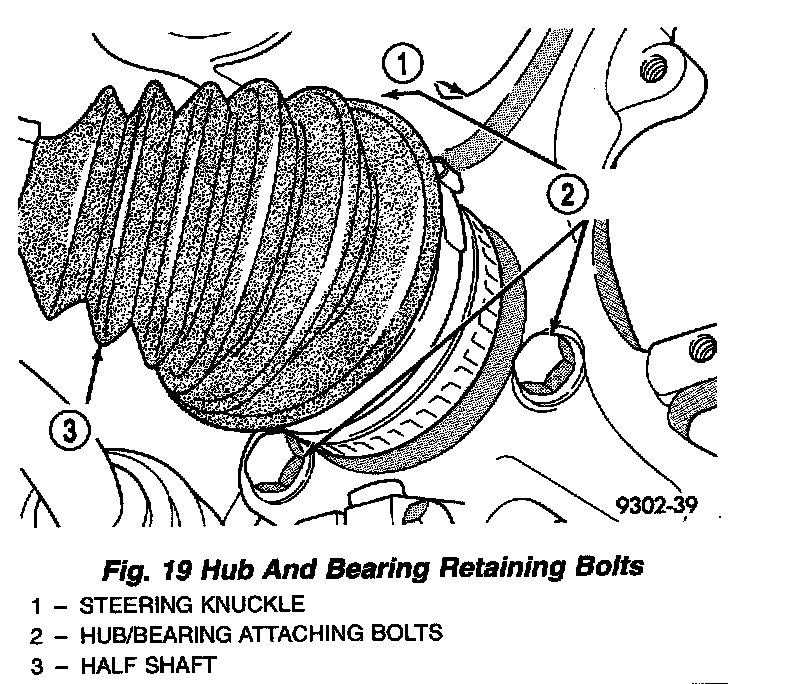 8. Remove the 3 steering knuckle to hub and bearing assembly attaching bolts.