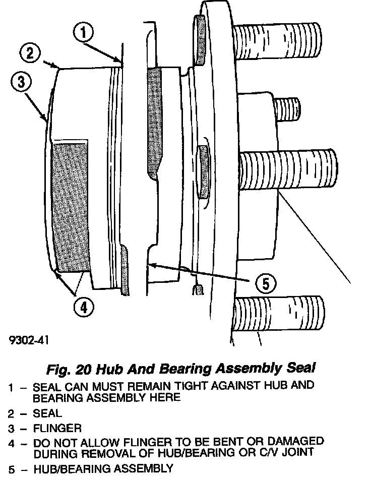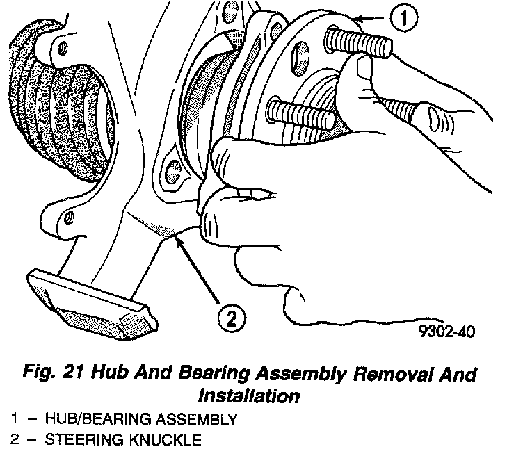 CAUTION: If metal sealon hub and bearing assembly is seized to steering knuckle and becomes dislodged on hub and bearing assembly during bearing removal the hub and bearing assembly MUST not be reused and MUST be replaced with a new hub and bearing assembly. Also if flinger discbecomes damaged (bent or dented) during removal, hub and bearing assembly must be replaced with a new hub and bearing assembly.