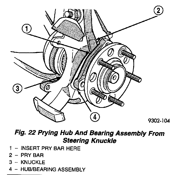 9. Remove hub and bearing assembly from steering knuckle. It is removed by sliding it straight out of steering knuckle and off end of stub axle. If hub and bearing assembly will not slide out of knuckle, insert a pry bar between hub and bearing assembly and steering knuckle and gently pry hub and bearing from knuckle. If stub shaft is frozen to hub and bearing assembly tap end of stub shaft with soft face hammer to free it from hub and bearing spline.