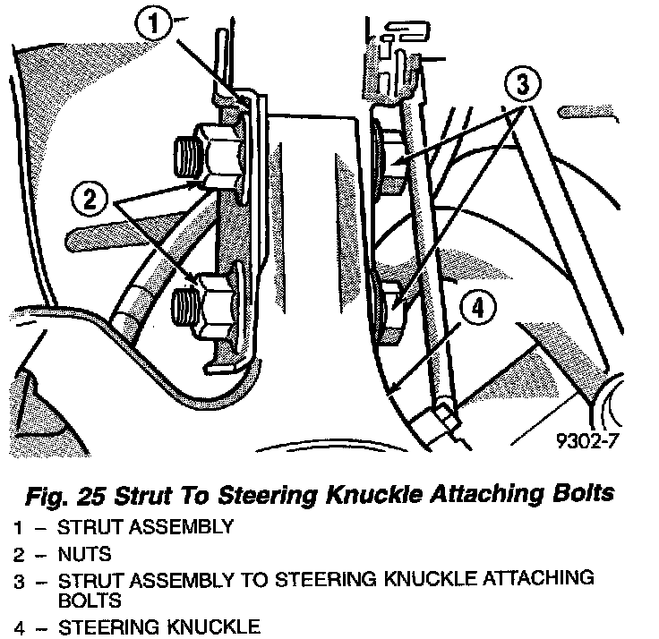 CAUTION: The strut assembly to steering knuckle bolts are serrated where they go through strut assembly and steering knuckle. When removing bolts, turn nuts off bolts DO NOT TURN BOLTS IN STEERING KNUCKLE. If bolts are turned damage to steering knuckle will result.