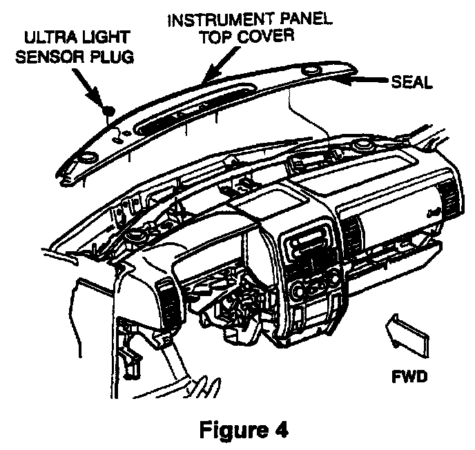 2. Using a trim stick or another suitable wide flat-bladed tool, gently pry the rear edge (farthest from the windshield) of the top cover up and away from the instrument panel (I/P) far enough to disengage the four (4) snap clip retainers (Figure 4).