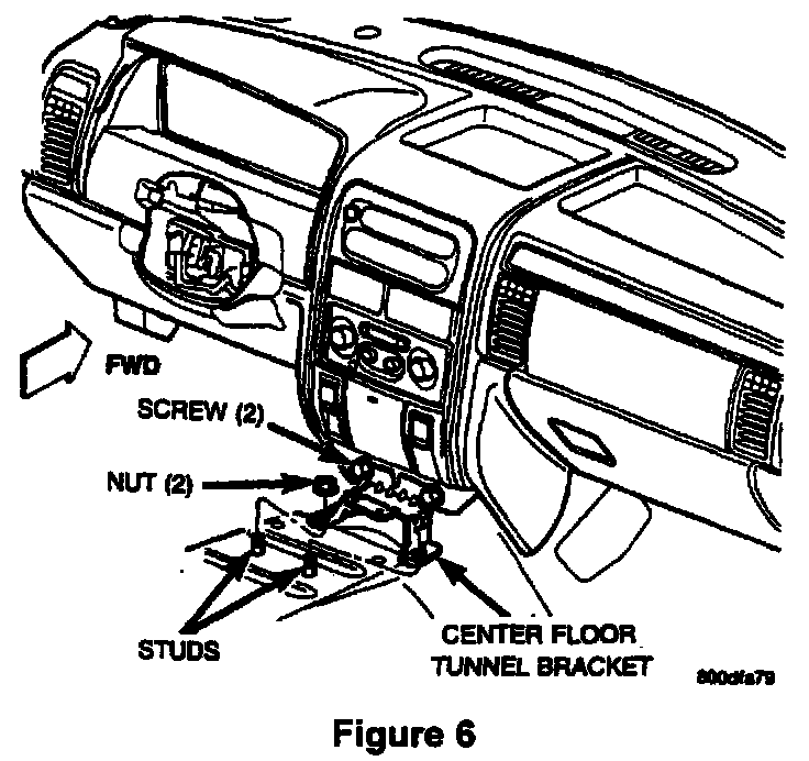 14. Remove the two (2) nuts that secure the center support bracket to the transmission tunnel. Set the support bracket aside (Figure 6).