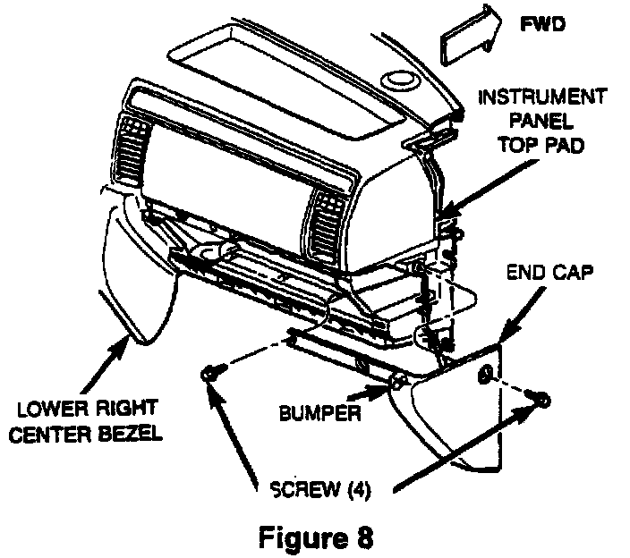 19. Remove the screws that secure the right I/P end cap to the I/P top pad and glove box opening. Disengage the snap clip and then remove the end cap (Figure 8).