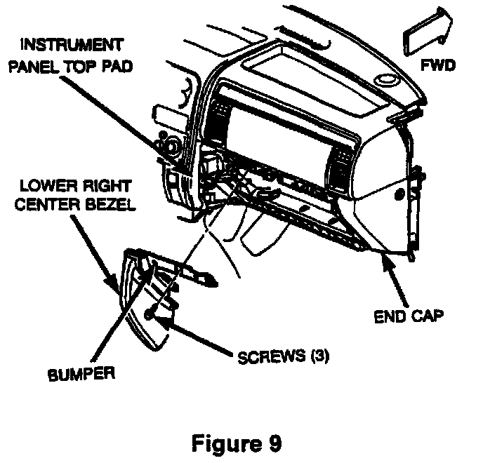 41. Install the lower right center bezel (Figure 9). Tighten the screws that secure it to the I/P glove box opening securely.