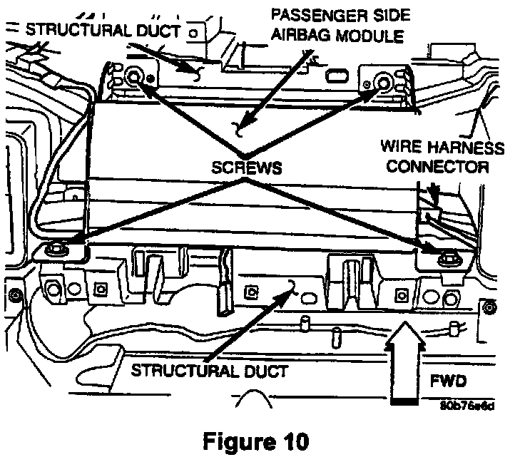 29. Remove the two (2) screws that secure the passenger airbag module end bracket rear mounting tabs to the rear of the I/P structural duct (Figure 10).