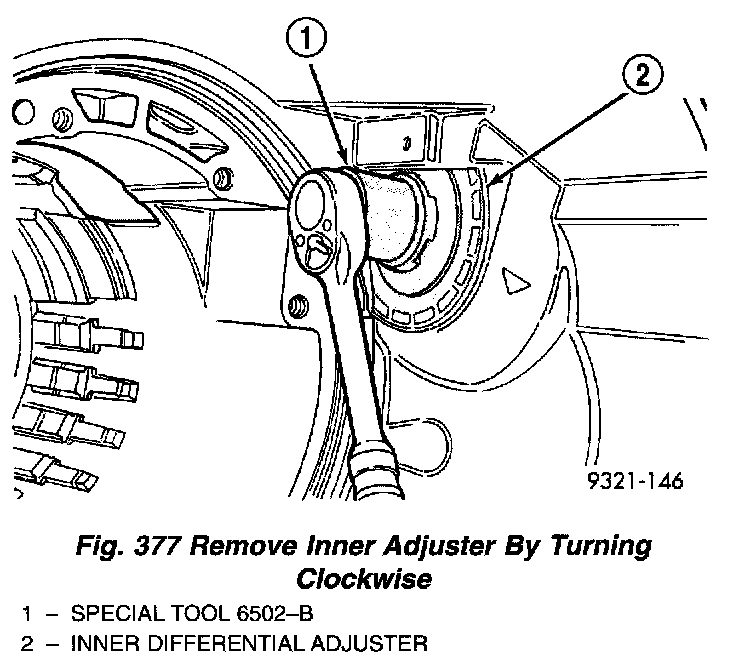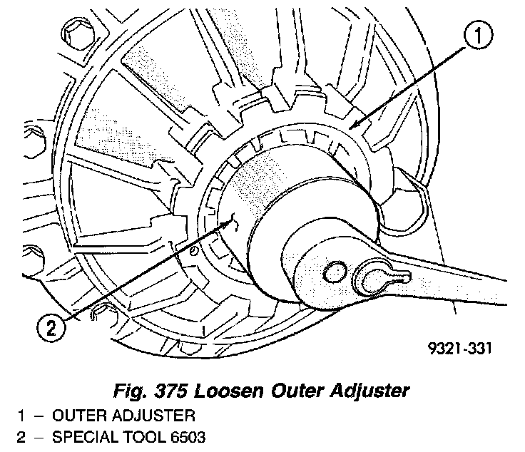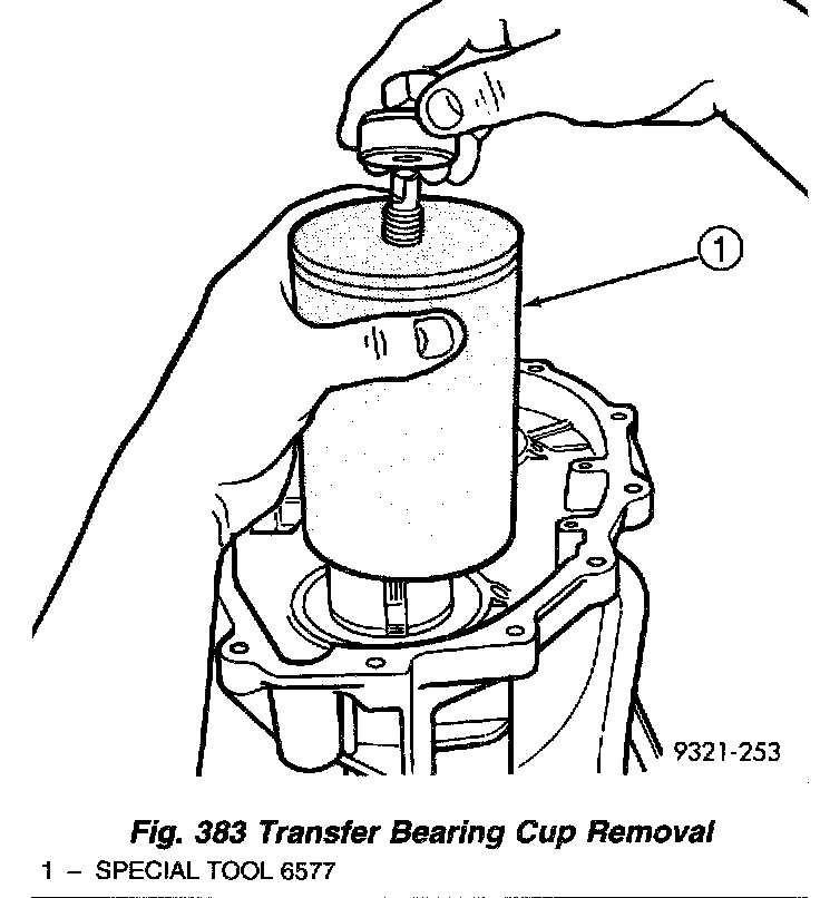 Install special tool 6577 to remove rear transfer bearing cup (Fig. 383).