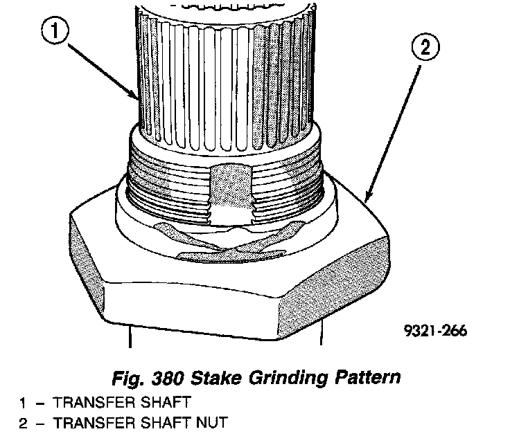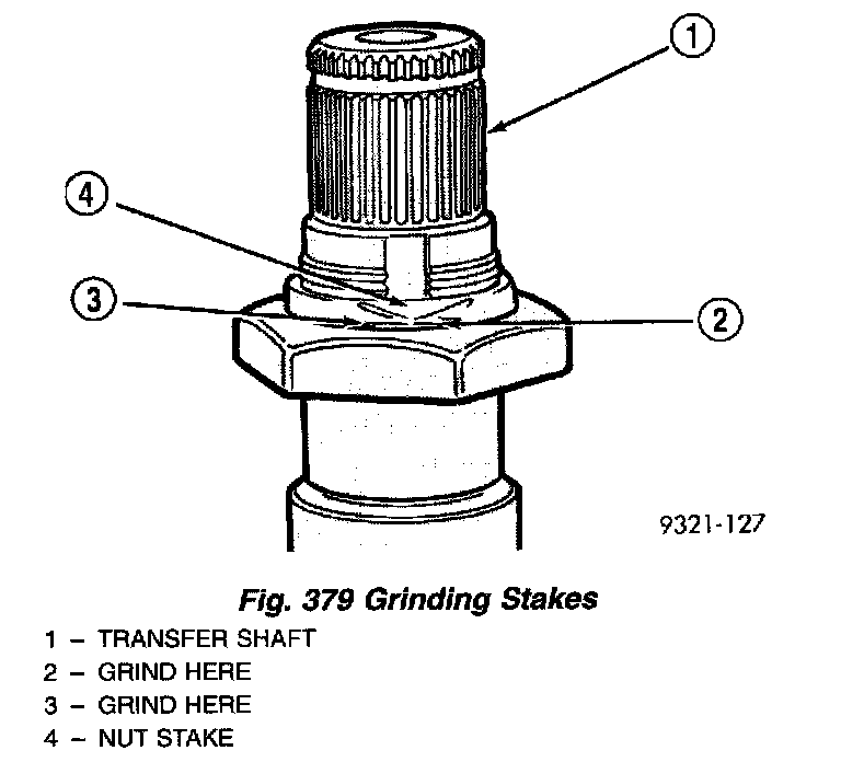 Using a die grinder or equivalent, grind the stakes in the shoulder of the shaft nut as shown in (Fig. 379) and (Fig. 380). Do not grind through the transfer shaft nut into the shaft. There are two stakes on the nut.