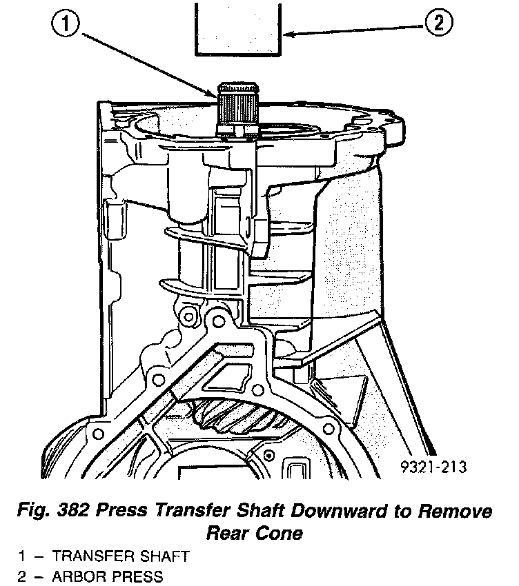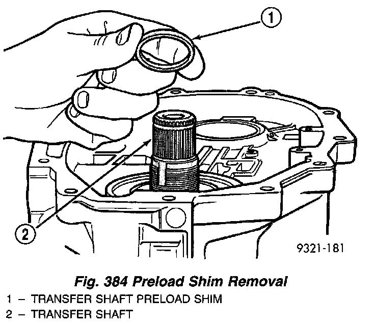 Remove transfer shaft preload shim (Fig. 384). If transfer shaft bearings are to be reused, the original shim must also be reused.