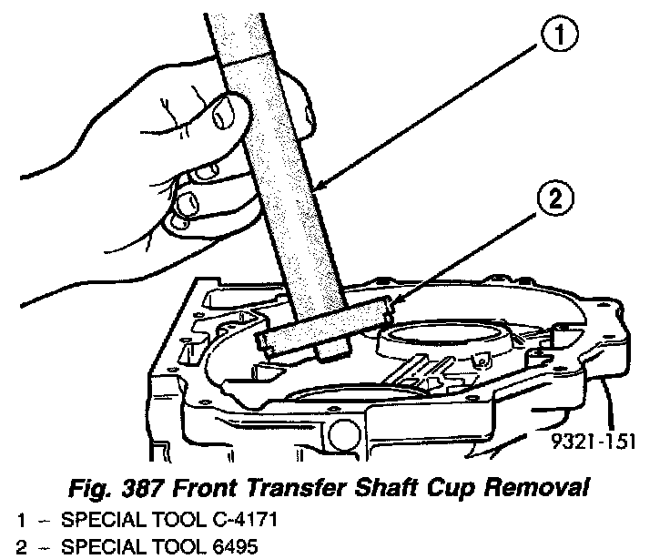 Remove the front transfer shaft bearing cup using special tool 6495 and handle C-4171 (Fig. 387). Use a press with special tools to remove cup.