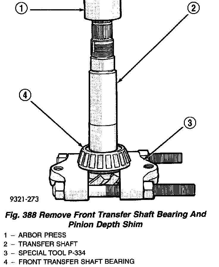 Support special tool P-334 on press table so that pinion head of transfer shaft can be pressed through table (Fig. 388).