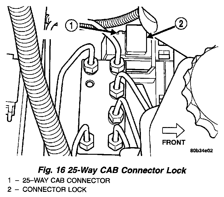 10. Disconnect the 25-way wiring harness connector from the CAB using the following procedure. Grasp the lock on the 25-way connector, and pull it up from the connector as far as possible. This will unlock and raise the 25-way connector out of the socket on the CAB.
