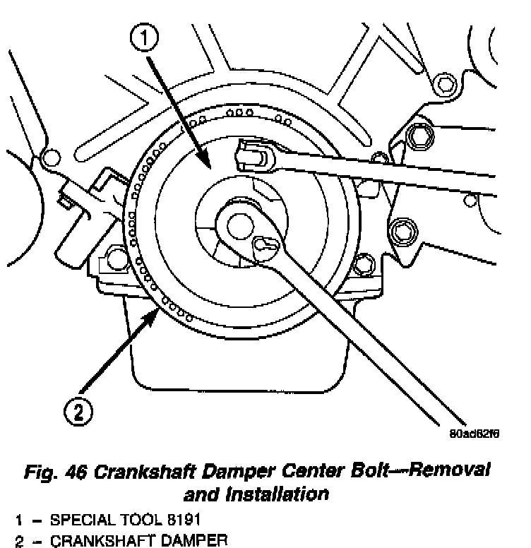 5. Use Special Tool 8191 to hold crankshaft damper while removing center bolt (Fig. 46).