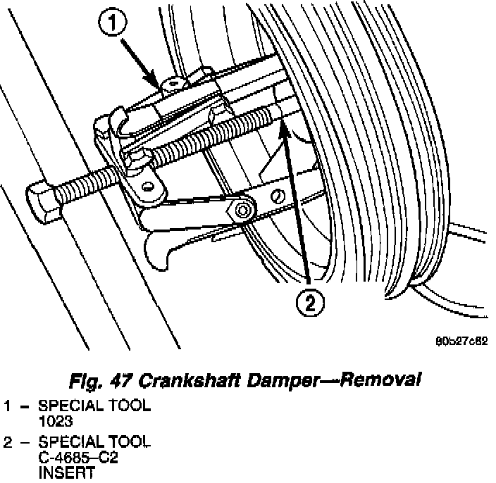 6. Use Special Tool 1023 puller, and insert C-4685-C2, remove crankshaft damper (Fig. 47).