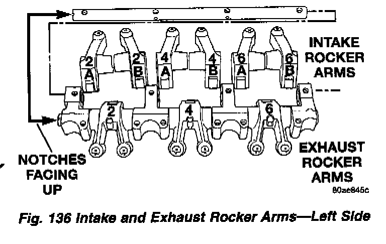 The intake and exhaust rocker arms are different. They should be identified before disassembling the assembly (Fig. 136).
