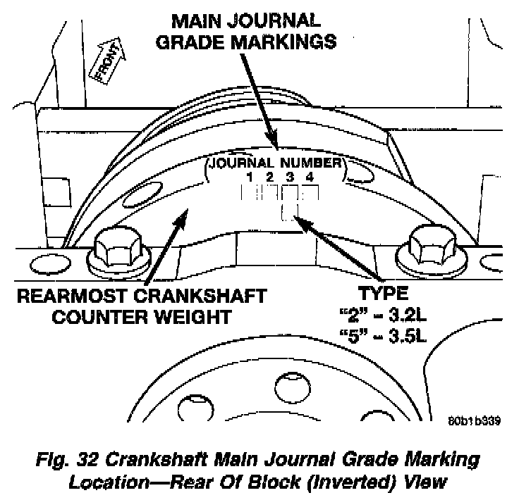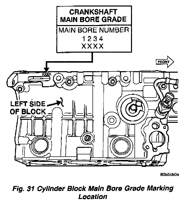 The main bearings are a "select fit" to achieve proper oil clearances. For main bearing selection, the block and crankshaft have grade identification marks.Fig. 31