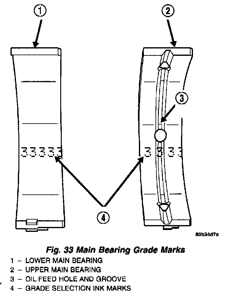 NOTE: Service main bearings have a number from (1 - 5) marked in ink on the bearing surface (Fig. 33). For verification, use the Main Bearing Selection Chart for number to size identification.