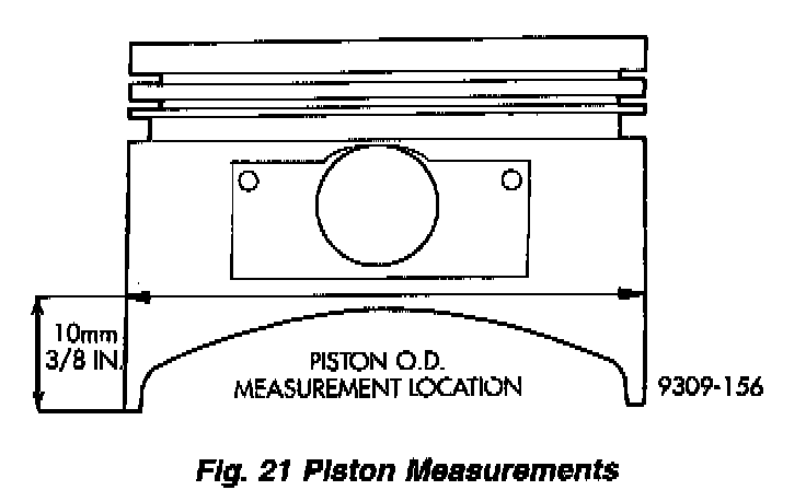 Piston and cylinder wall must be clean and dry. Piston diameter should be measured 90° to piston pin at size location shown in (Fig. 21). Cylinder bores should be measured halfway down the cylinder bore and transverse to the engine crankshaft center line. Refer to Cylinder Block assembly, Piston, Engine for Specifications. Pistons and cylinder bores should be measured at normal room temperature, 70°F (21°C).