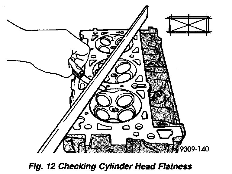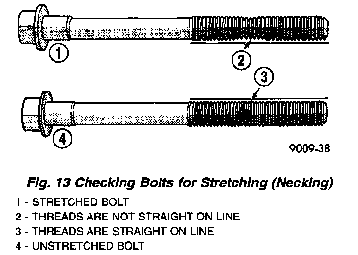The cylinder head bolts are tightened using a torque plus angle procedure. The bolts must be examined BEFORE reuse. If the threads are necked down the bolts must be replaced. Necking can be checked by holding a scale or straight edge against the threads. If all the threads do not contact the scale the bolt must be replaced.