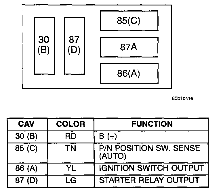 3. The relay normally open terminal (87) is connected to the common feed terminal (30)in the energized position. This terminal supplies battery voltage to the starter solenoid field coils. There should be continuity between the cavity for relay terminal 87 and the starter solenoid terminal at all times. If OK, go to Step 4. If not OK, repair the open circuit to the starter solenoid as required.