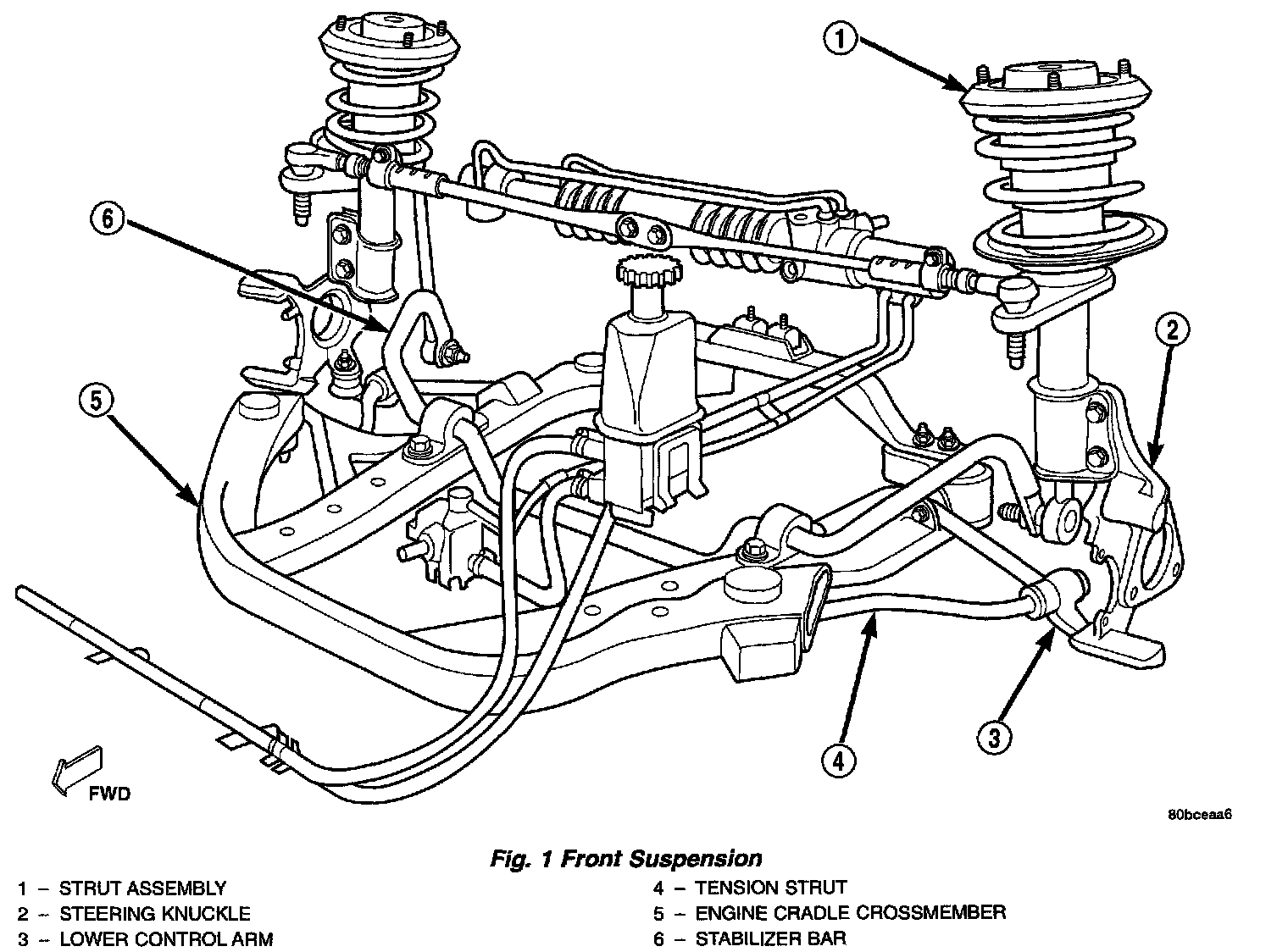 DESCRIPTIONThe lower control arm is a steel forging with 2 rubber bushings and a ball joint. The bushing isolating the lower control arm from the front cradle/crossmember is a metal encased pivot bushing. The bushing isolating the lower control arm from the tension strut is a solid rubber bushing. The lower control arm is bolted to the cradle/crossmember using a bolt through the center of the pivot bushing. The tension strut is fastened through the center of the tension strut bushing and lower control arm. The lower control arm ball joint connects to the steering knuckle.