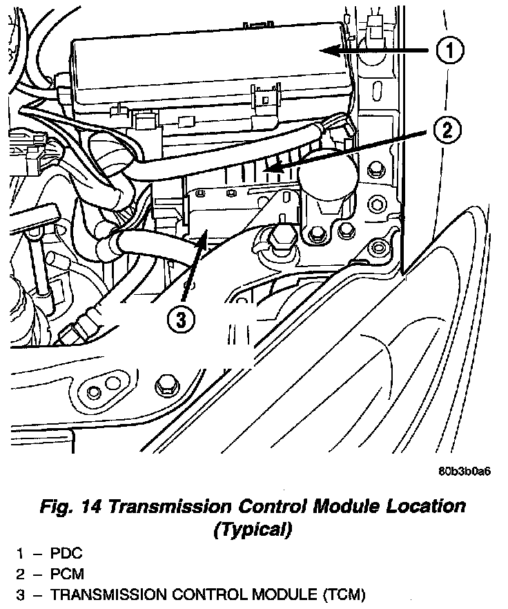 The Transmission Control Module (TCM) is located in the engine compartment on the left (driver's) side next to the Power Distribution Center (PDC) (Fig. 14).