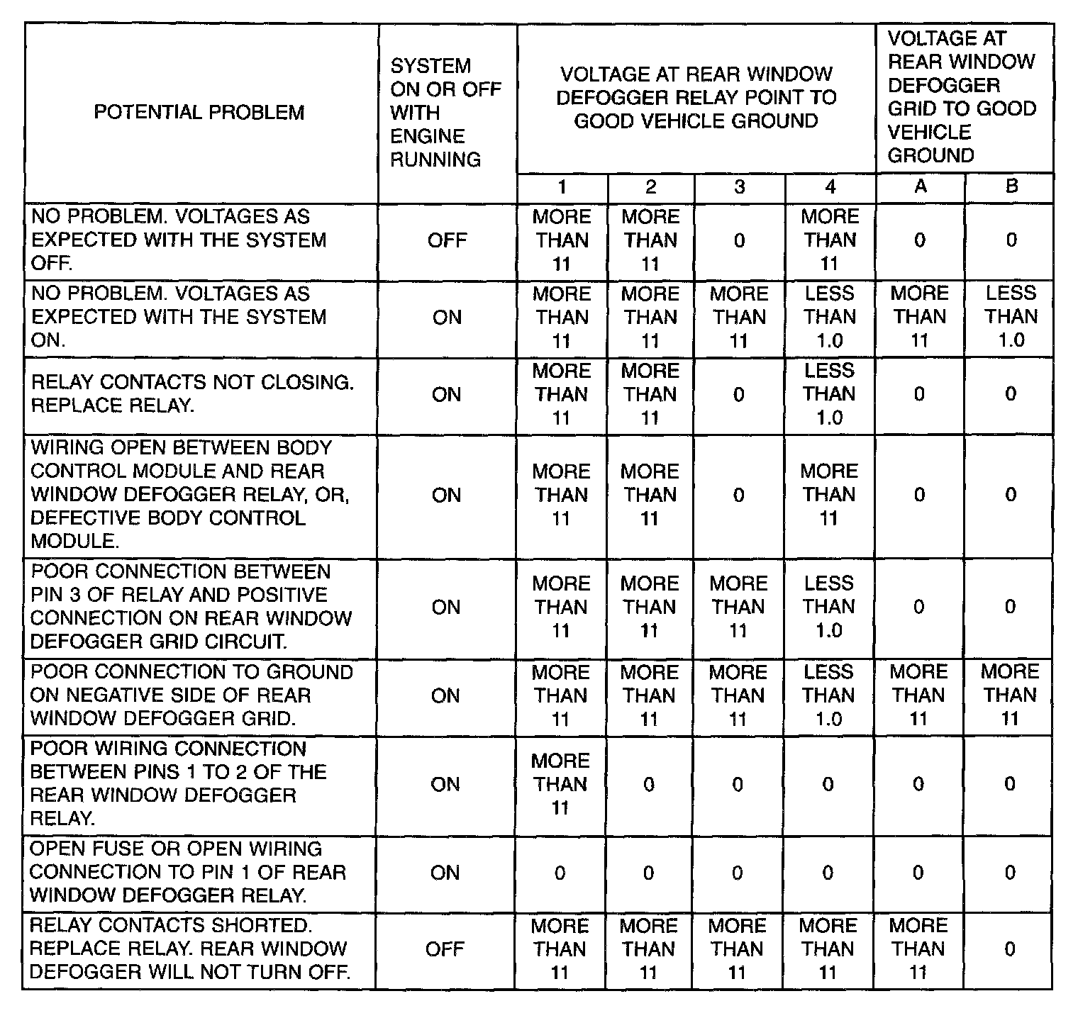 3. Check voltages at rear grid relay and refer to Rear Widow Defogger Relay Test table.