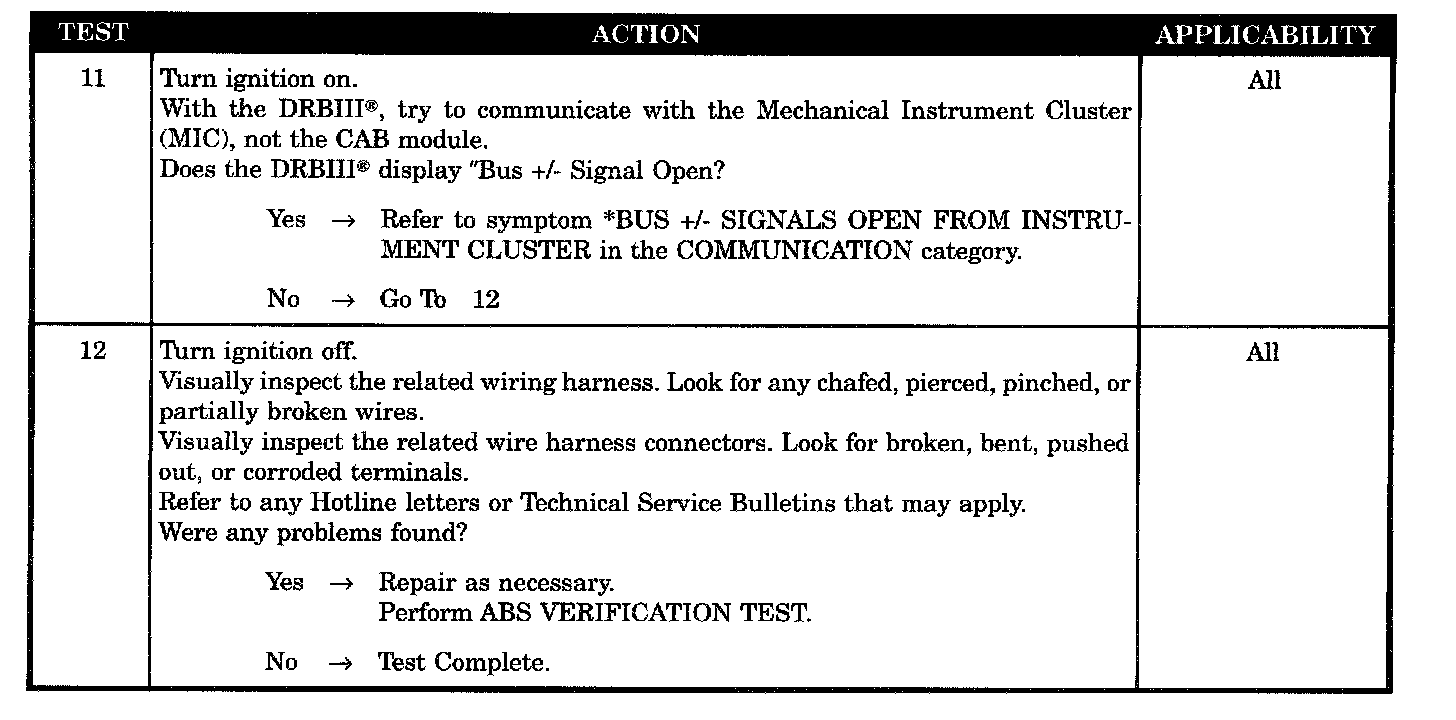 Set Condition: This DTC will be set when the message from the instrument cluster, via PCI Bus, informs the CAB that it can not turn on the ABS Warning Indicator or the Red Brake Warning Indicator.